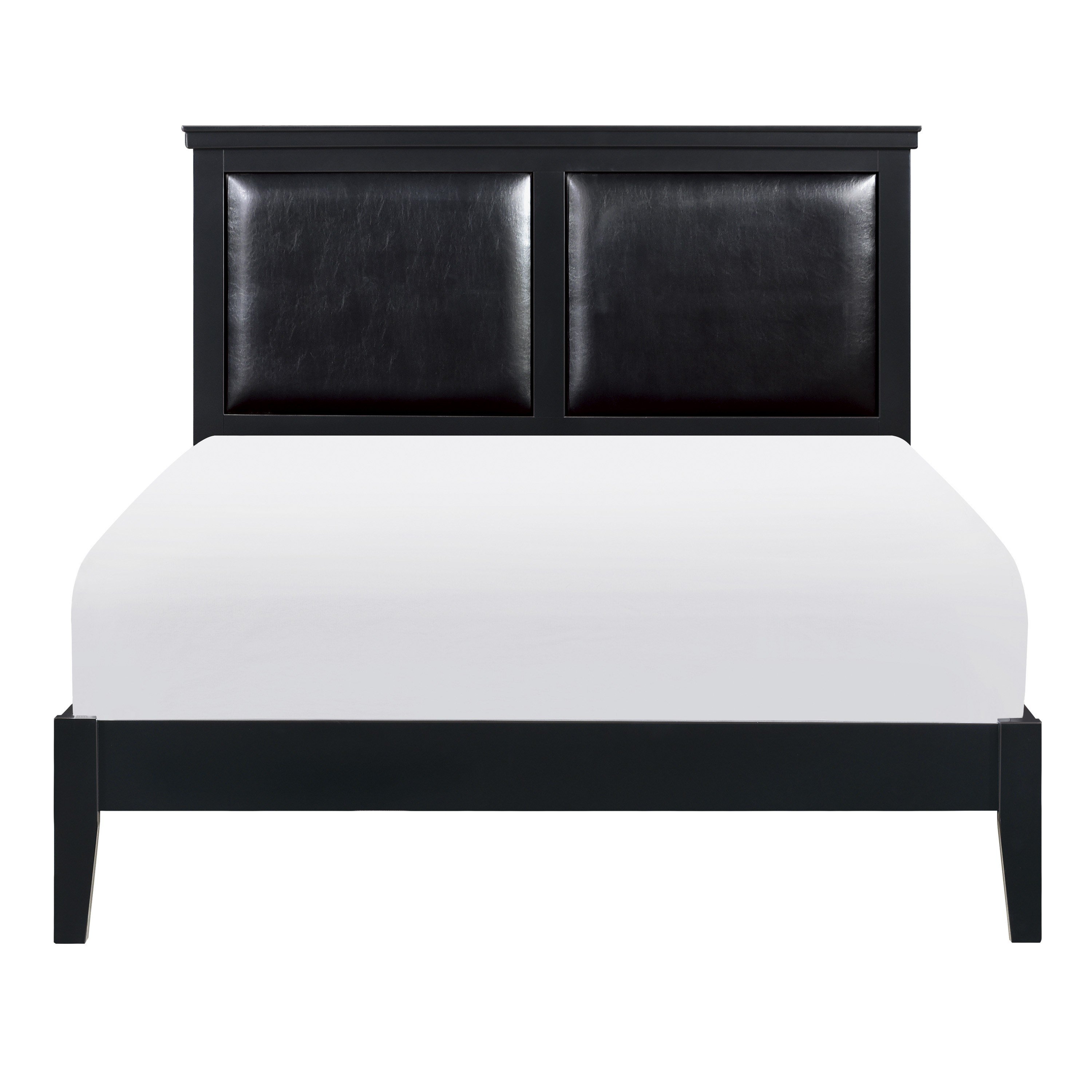 Merging traditional and transitional design creates the look of the Seabright collection, providing a unique platform from which to style your bedroom. The black painted finish allows for exceptional versatility of placement and decorative inspiration. The queen bed features framed, color-coordinated, dual faux leather padded headboard inserts and an ultra-low-profile footboard.PRODUCT DIMENSIONS: Overall Dimension: 64.5" x 84" x 52.5"HHeadboard width: 64.5"Headboard height: 52.5"Footboard width: 63"Footboard height: 14"Rail to floor: 8.5"Listing Includes: One Queen Size Bed Only.Mattress: Not IncludedSimple Assembly Require.