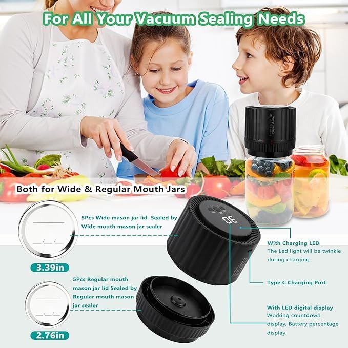 • [Long Battery Life]Once charge to seal 80+ mason jars! With USB C-rechargeable battery which boasts long capacity and low consumption, to keep good vacuum for jars.