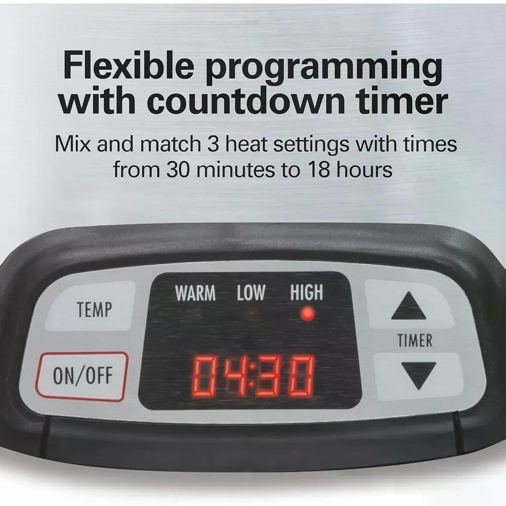 Perfect for Family Meals, Potlucks & PartiesThe 8 quart, large capacity slow cooker has a stoneware crock that can fit everything from lasagna and desserts to large cuts of meat. It will hold an 8 lb. chicken or a 6 lb. roast. Serves 10+ people. | Flexible Programming with Countdown TimerMix and match warm, low or high heat settings with adjustable programming times from 30 minutes to 18 hours. The convenient countdown timer on the LED display shows you how long until food is ready. | Set & ForgetThe slow cooker automatically switches to the warm heat setting after cooking is complete. No watching or stirring needed. You can set it and forget it. |