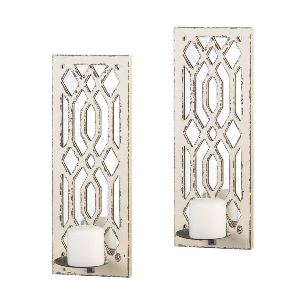 • This pair of gorgeous candle wall sconces will cast geometric shadows and luminous candlelight across your living space with timeless style.