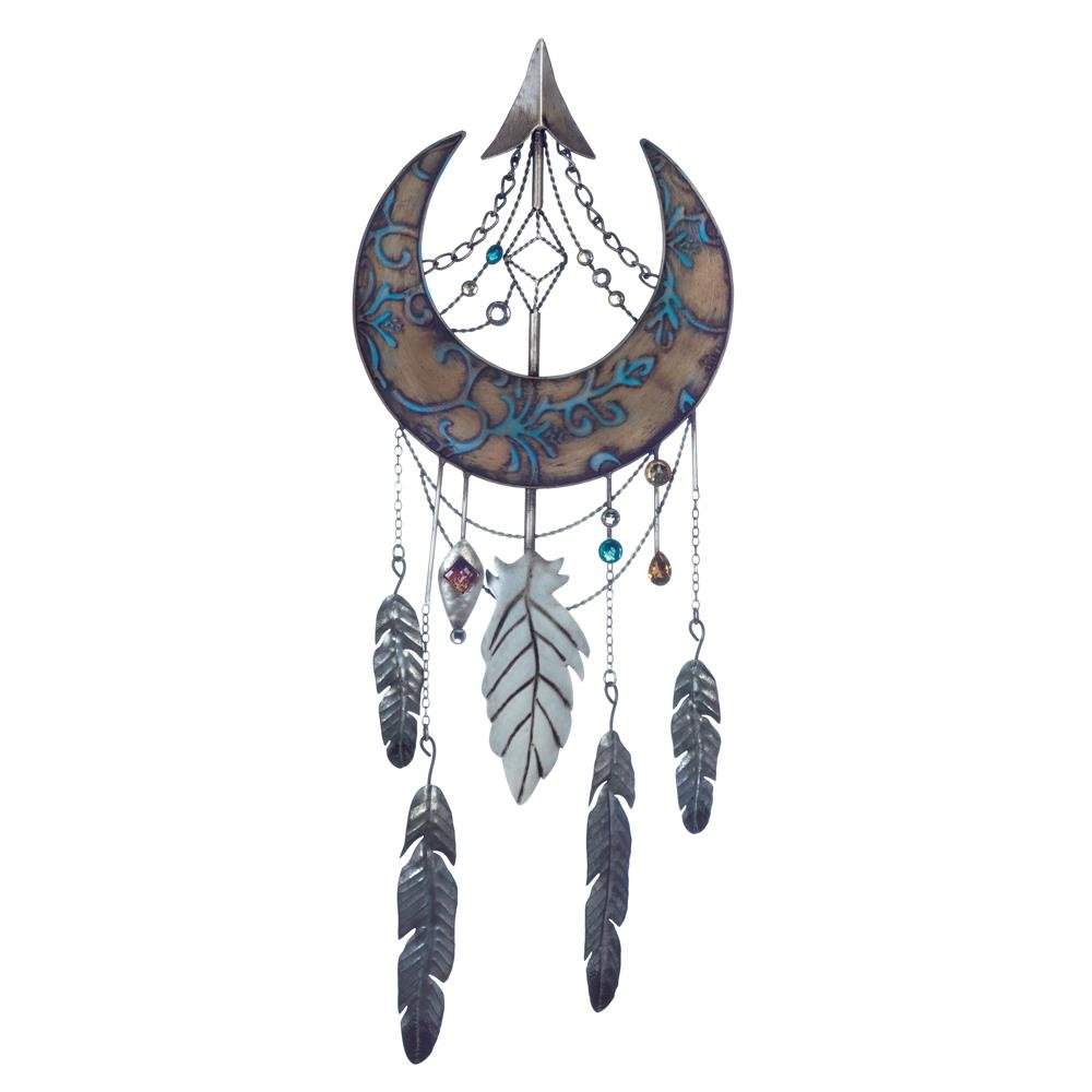 This beautiful interpretation of a dream catcher will catch your eye over and over again when you hang it on your wall. If features a lovely crescent moon with a beautiful design that's decorated with jewels and feathers that hang below. Weight 0.8 pounds. 10.5" x 0" x 28.5". Iron. UPC Number: 849179035723.