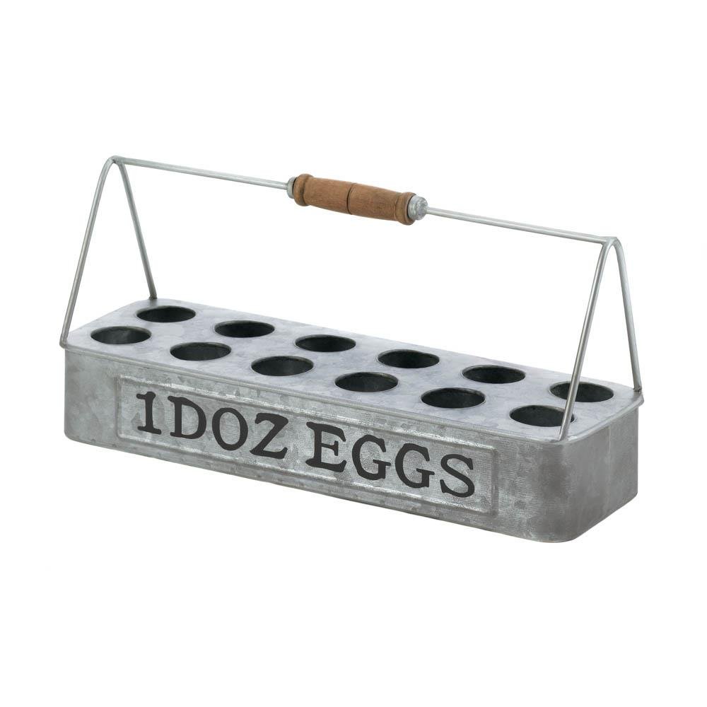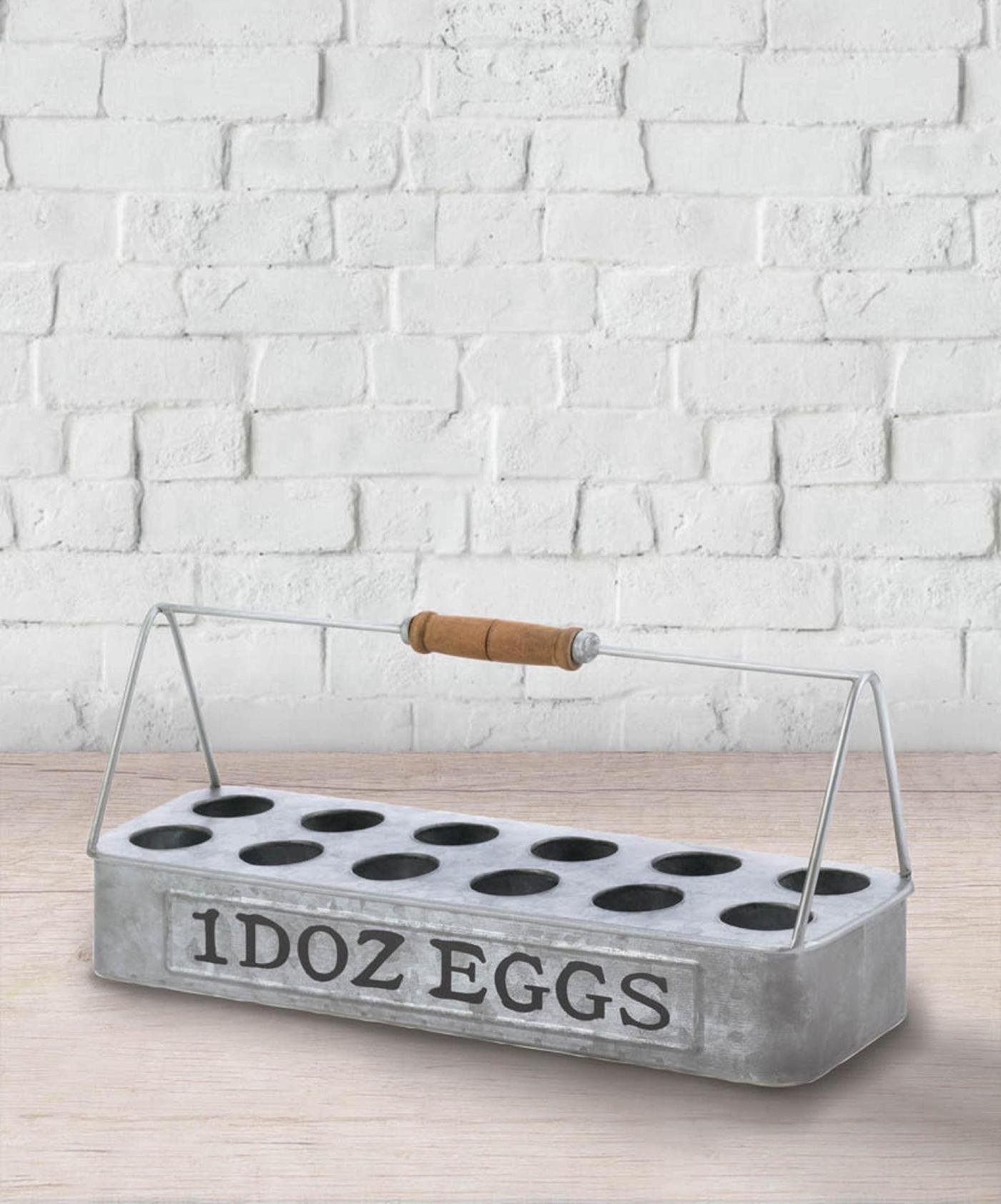 • This galvanized egg basket is a chic way to collect and store your eggs. Perfect for Farmhouse-style décor or those with backyard coops, this egg holder includes enough spots to carry a dozen eggs.