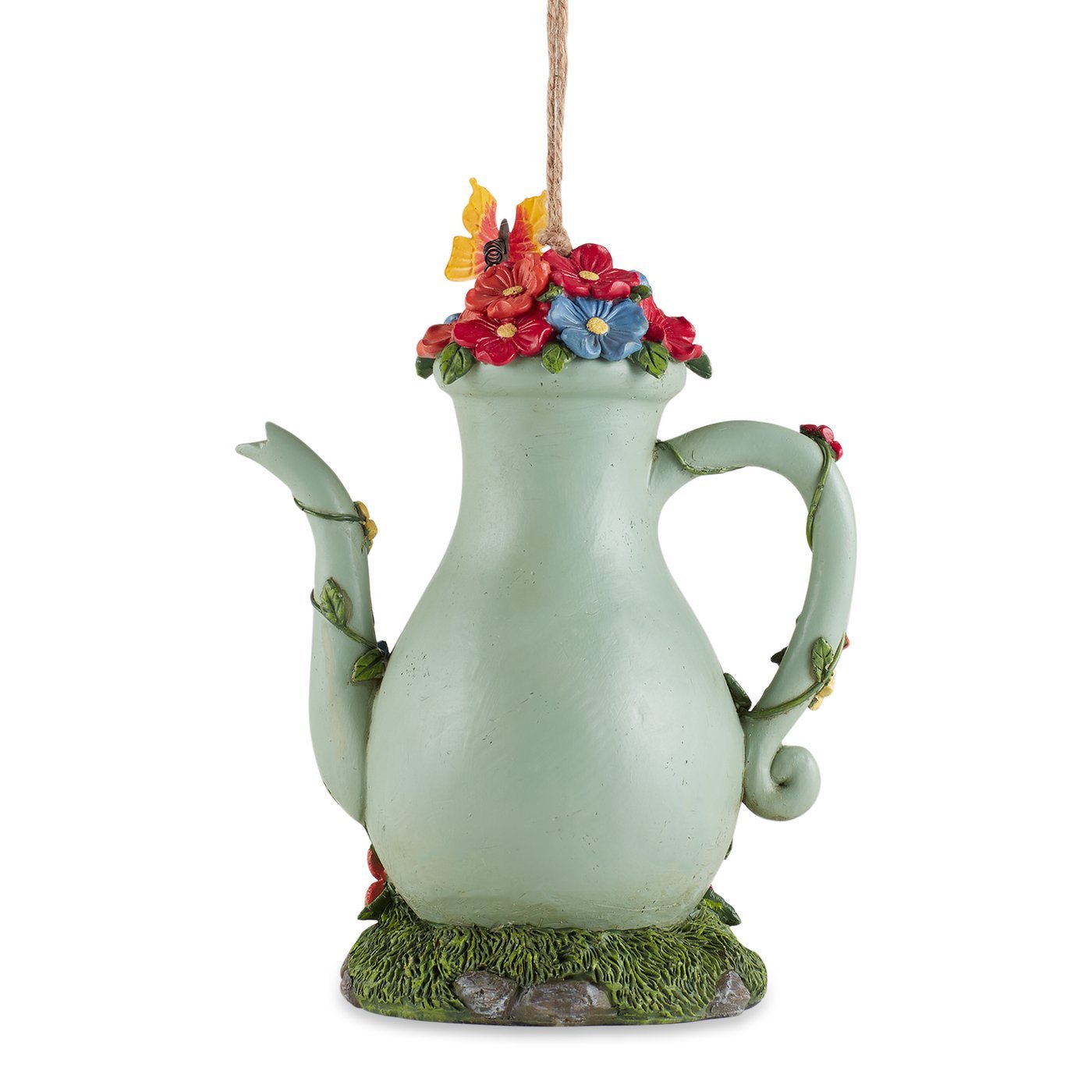 • This adorable teapot birdhouse will add colorful charm to your outdoor space while providing a fun home for the birds in your yard.