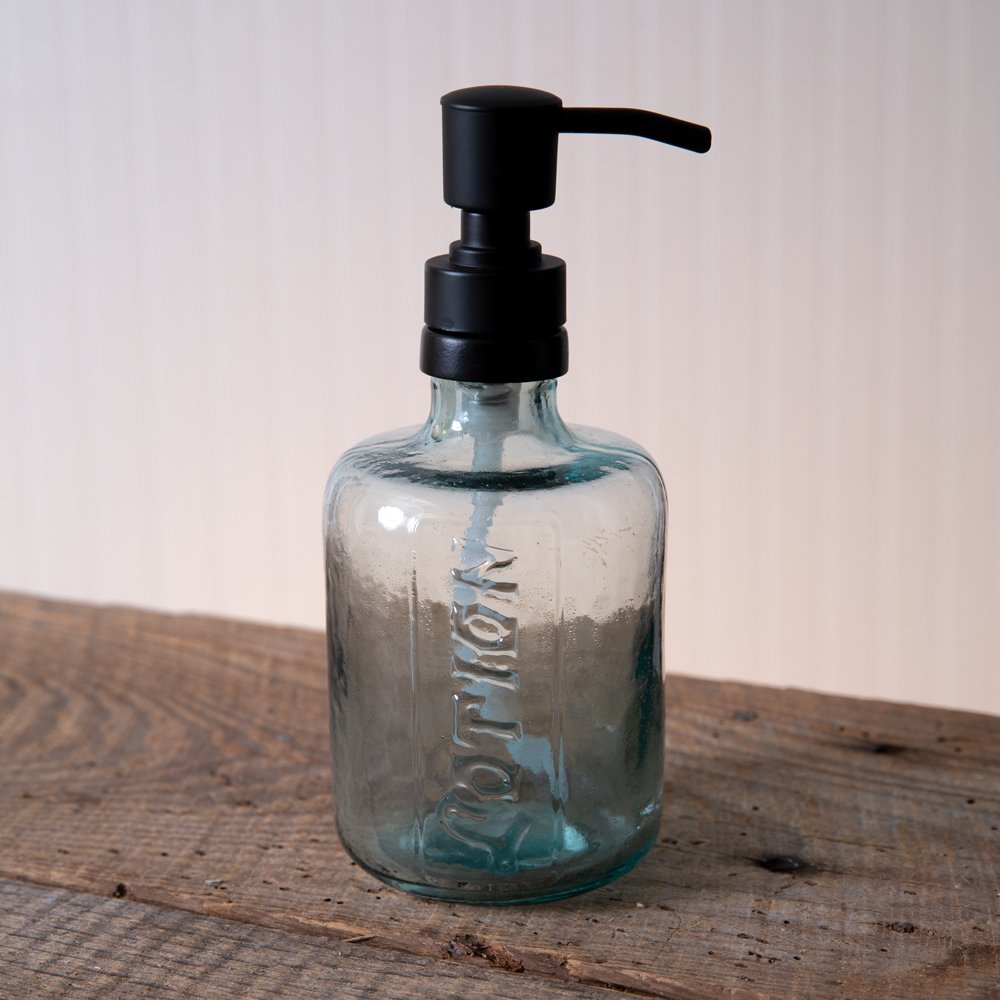 Our vintage style lotion dispenser will compliment your bath and kitchen decor in almost any style. It features durable glass and an embossed lotion motif. Pumper is finished in matte black. Dispenser holds 14 oz of liquid.