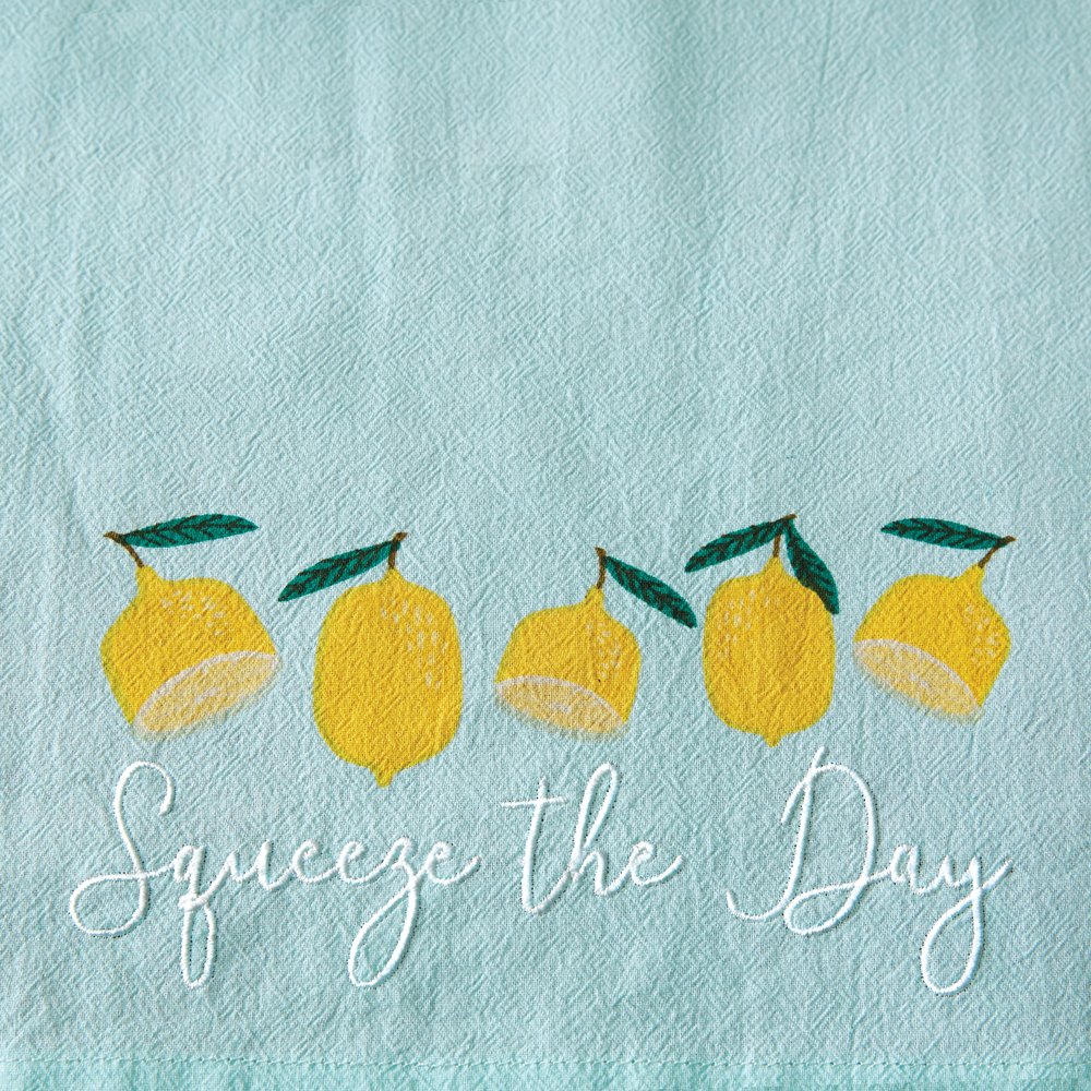 Squeeze the day! This fun and bright kitchen essentials set will add a pop of color into your cooking area. Set includes an apron and tea towel. Tea towel is 20''W x 28''H. Apron has a neck tie, a waist tie, and a pocket in the front. Made of 100% cotton. Tea towel features a corner hanging tab. 100% Cotton. Machine wash cold. Tumble dry. Warm iron on reverse.