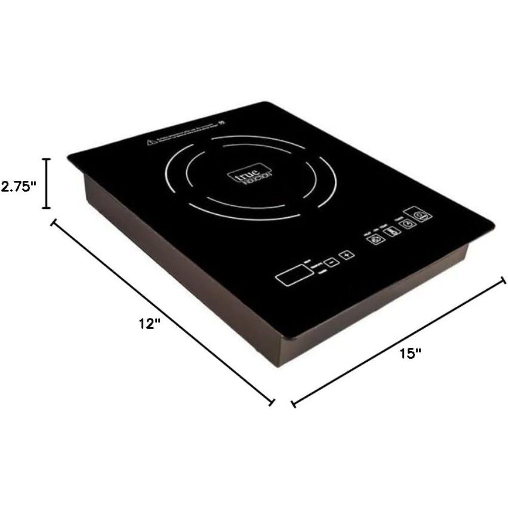 Cooktop is 11 13/16" W x 14 15/16" L x 2 13/16"H, runs off a standard 110V outlet and has 1800 watts of cooking power