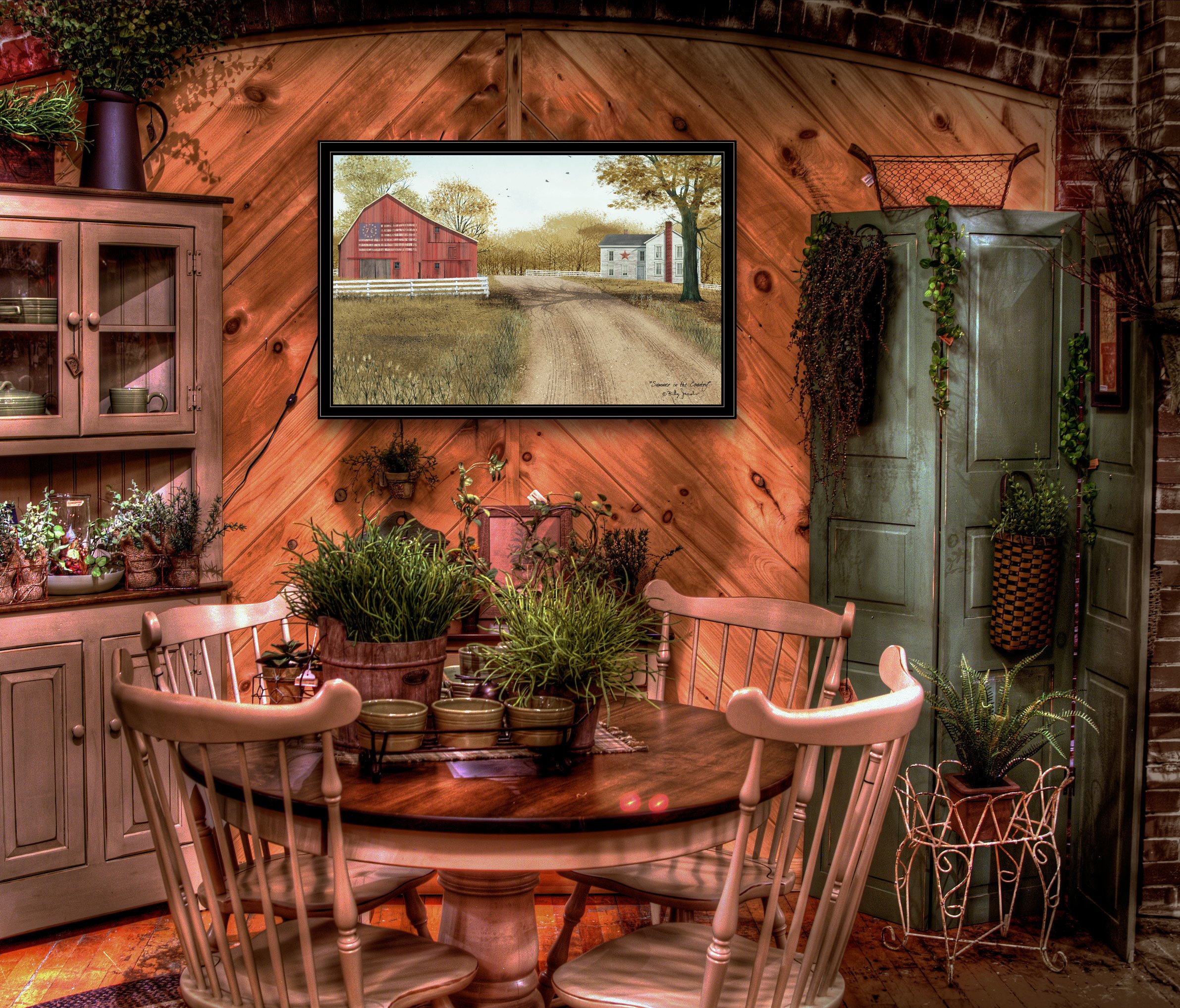 "Summer in the Country" a framed Giclee print by artist Billy Jacobs, in a stylish 38" x 26" black frame. This art features a picturesque country road passing through the countryside during the summer season. There's a red barn on the left with a large rendition of Old glory painted on the siding. On the right there's a 2 story white clapboard farm house with a tall red brick chimney. A rustic metal barn star makes a great accent against the white of the house, and the property is set off by a white wooden fence. Crafted By Skilled American Crafters And Coated With A Fade-resistant Texture, This Piece Has A Canvas-like Appearance That Will Last For Years To Come. Invest In A Piece That Is Truly One-of-a-kind.•Transform your walls with this stunning piece of art and bring a touch of modern elegance to your room. This stunning piece will not only add visual interest to any room but it's minimalist design will bring a sense of serenity to your space.•Tired of dull, empty walls in your home? We believe that walls should inspire, not bore. That's why we offer a wide range of wall art to suit any space from bedroom and kitchens to office and beyond. Give your walls a facelift with our printed arts and transform your space into a stylish and inviting home.•This framed wall art is hand-crafted in the USA of high-quality wood with the surface of the art coated with a fade-resistant texture which gives it a canvas-like appearance for many years of enjoyment in your home.•Bring a pop of colour and style to any room with our fully assembled and ready-to-hang wall art. With a wide selection of decorative pieces to choose from, you'll easily find the perfect match for your personal taste or to give as a thoughtful gift. Don't miss out on the opportunity to add some unique charm to your space.•Experience the unmatched quality and durability of American-made craftsmanship with this individually hand-crafted wall decoration art. Skilled crafters put their expertise into every piece to ensure it will stand test of time and bless your eyes for years to come.