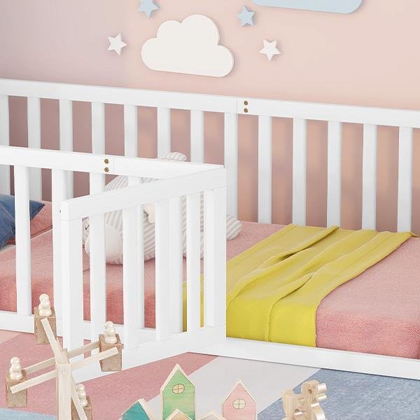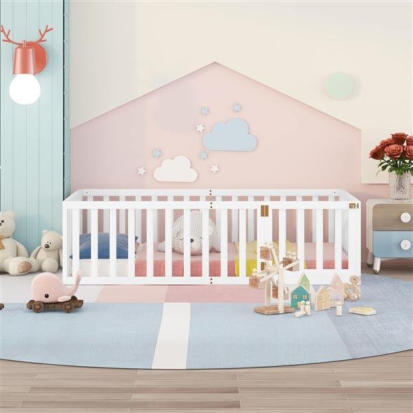 Twin Size Wood Floor Bed Frame with Fence and Door, White